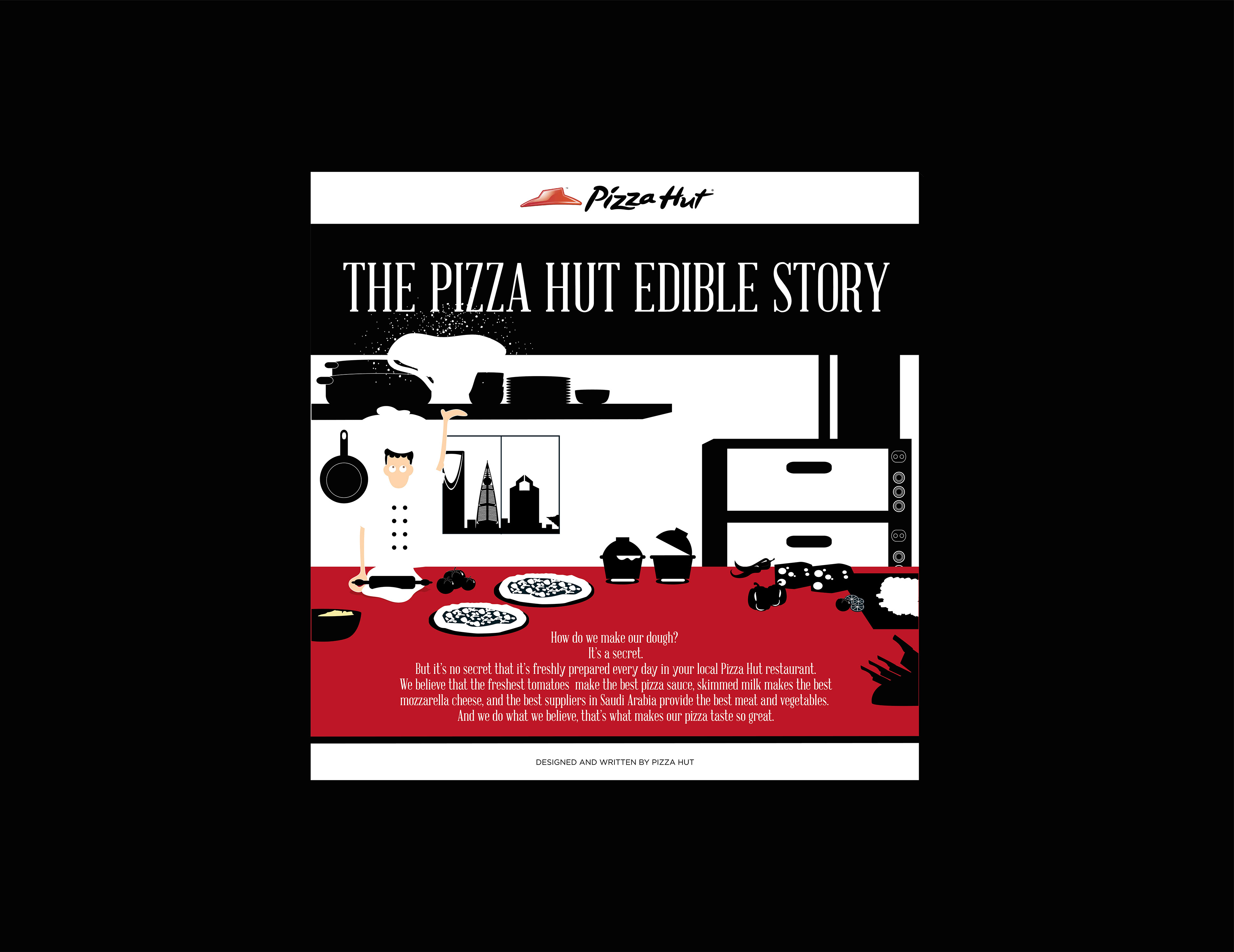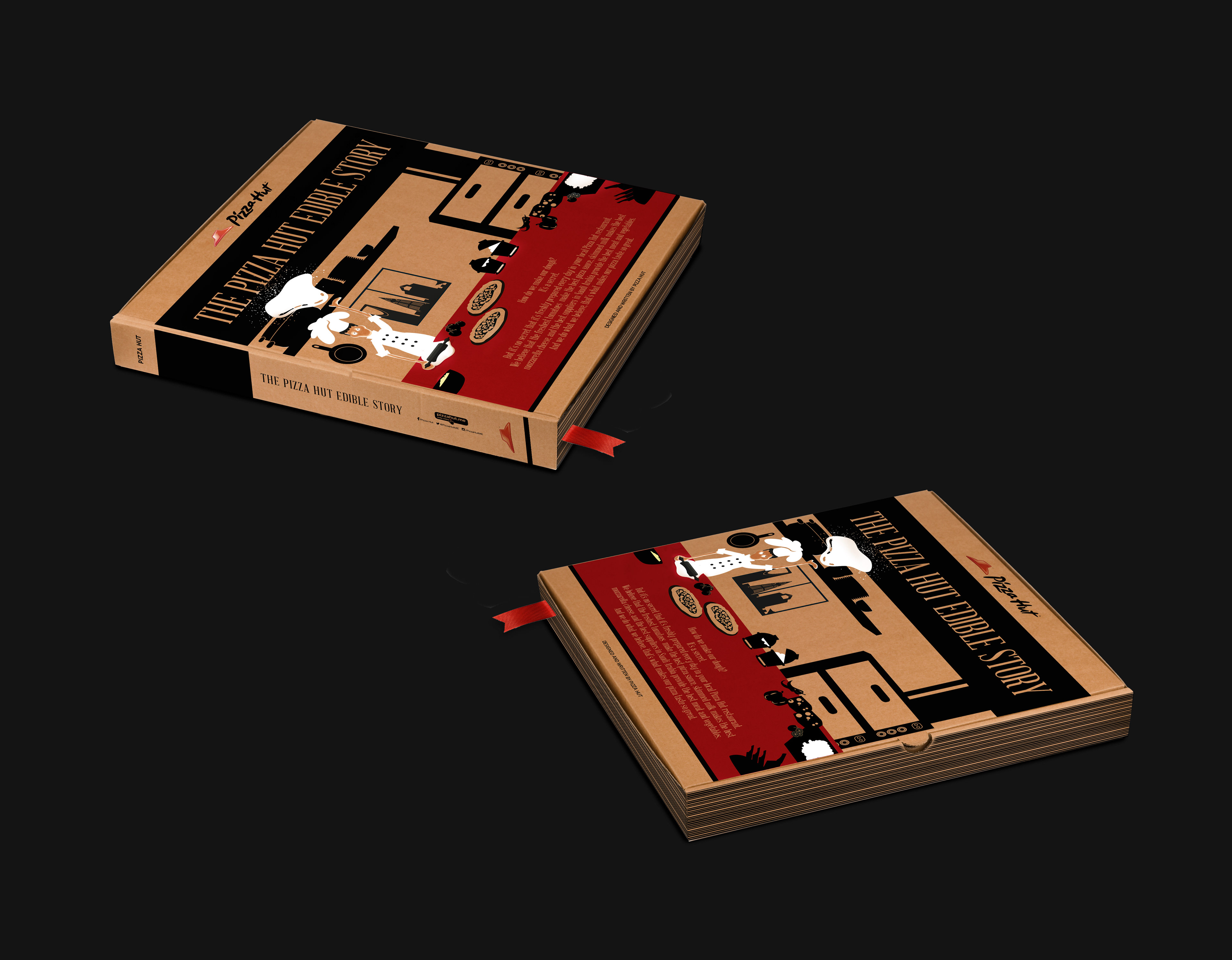 Pizza Hut wanted to establish themselves further in KSA. This packaging concept featured a brand story on the box and printed sideways to mimic a book. Art Director: ZorZi El Hayek Copywriter: Scott Turner
